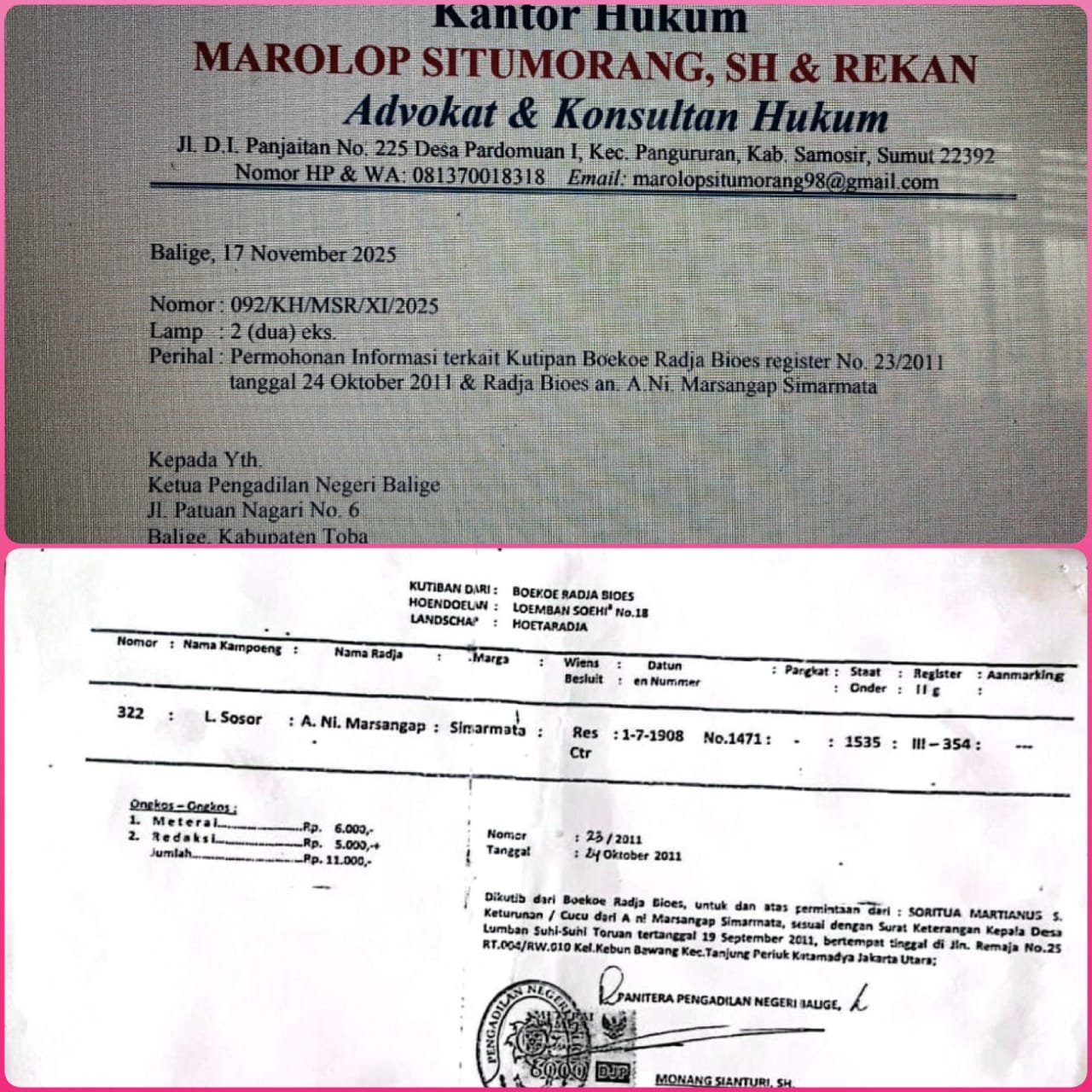 Dalam surat tersebut, kuasa hukum meminta penjelasan rinci. Pertama, mereka menanyakan apakah surat keterangan “Kutipan Dari: Boekoe Radja Bioes” Nomor 23/2011 tercatat dalam Buku Agenda Surat Keluar PN Balige. Jika tercatat, mereka meminta salinannya.